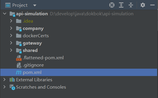 这个项目的名称为api-simulation,其包含了三个子模块,分别为company、gateway及shared。