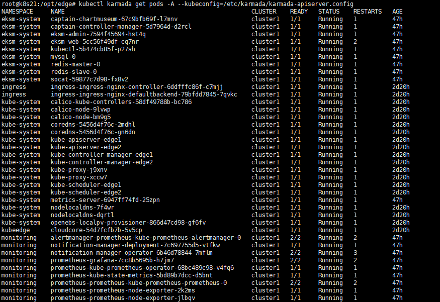 kubectl karmada get pods -A --kubeconfig=/etc/karmada/karmada-apiserver.config