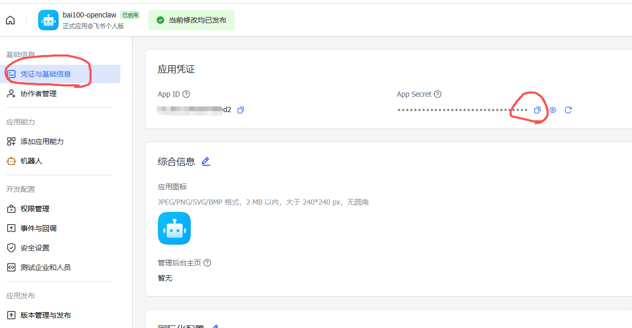 打开飞书【凭证与基础信息】拷贝App ID与App Secret